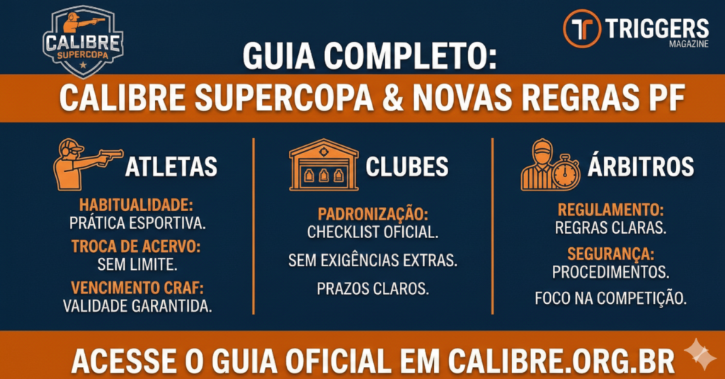 Recentemente, a Polícia Federal emitiu uma série de ofícios e despachos que trazem excelentes notícias, desburocratizam processos e garantem a segurança jurídica dos CACs. Preparamos este compilado oficial para que toda a comunidade da Calibre Supercopa (Competidores, Árbitros, Estandes e Clubes de Tiro) saiba exatamente como proceder em 2026.